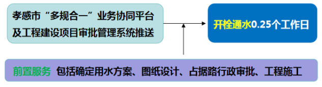 流程說明:供水企業(yè)通過孝感市“多規(guī)合一”業(yè)務(wù)協(xié)同平臺及工程建設(shè)項目審批管理系統(tǒng)推送獲取項目建設(shè)信息后主動對接,先行開展確定用水方案、圖紙設(shè)計、工程施工等服務(wù),辦理用水工程涉及的占道、掘路、占用綠地、伐移樹木等相關(guān)行政審批手續(xù),提前完成外線工程實施,為客戶提供“無感免申請”服務(wù)。客戶需要用水時,0.25個工作日內(nèi)開栓通水。