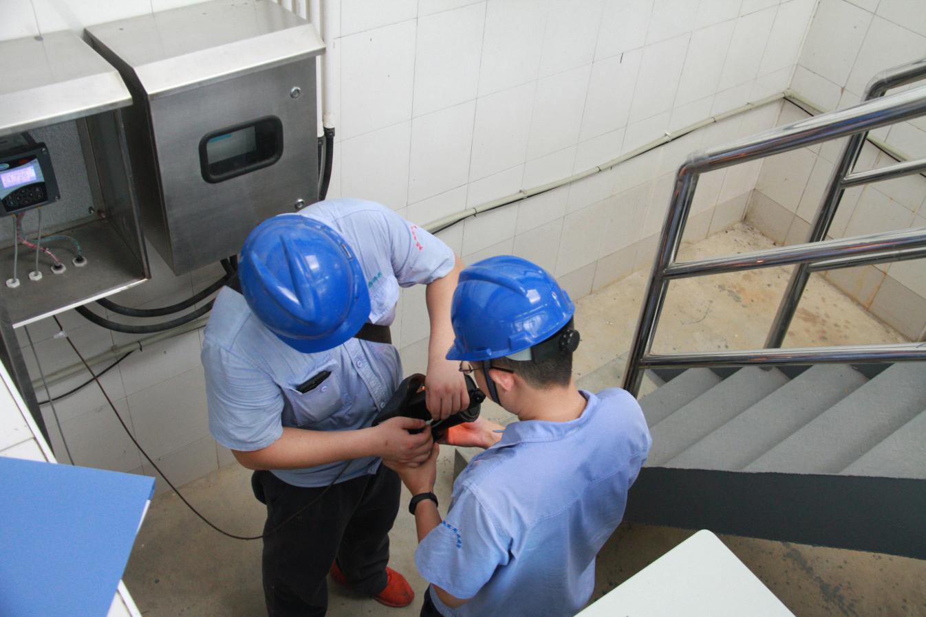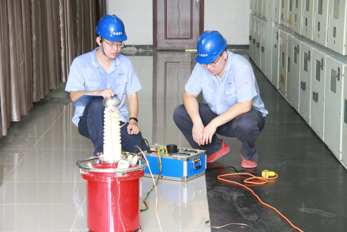 8月15日上午10點(diǎn),三名維修中心工作人員在三水廠配電間對(duì)施工用的絕緣工具進(jìn)行高壓試驗(yàn)。維修人員告訴我們,這個(gè)作用是為了檢測(cè)絕緣工具效能是否完好,能否正常工作,如果絕緣出現(xiàn)問題的話,會(huì)帶來很大的安全隱患。