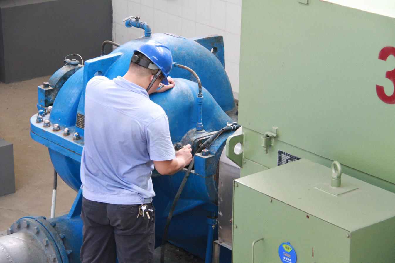 檢測(cè)結(jié)束后,維修人員又來到了送水泵房,40多度的廠區(qū)內(nèi),3個(gè)大水泵發(fā)出巨大的聲音,給原本密閉的廠房又增添了一絲燥熱。送水泵房是供水系統(tǒng)的最后一步,承擔(dān)著輸送孝感城區(qū)和周邊鄉(xiāng)鎮(zhèn)以及云夢(mèng)城區(qū)和周邊鄉(xiāng)鎮(zhèn)80多萬(wàn)居民生活用水的重任,水泵一旦出現(xiàn)問題,就會(huì)影響居民的正常用水。為了保證用戶的用水安全,維修人員每天都會(huì)對(duì)送水機(jī)組進(jìn)行檢查和維護(hù)。通過用手摸、用眼看、用耳聽,檢查送水機(jī)組的運(yùn)行狀態(tài),確定下一步的維護(hù)方案。